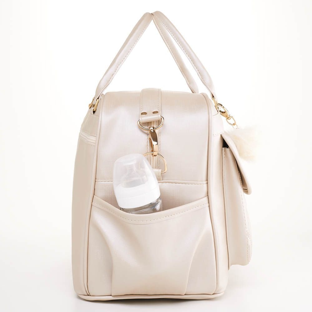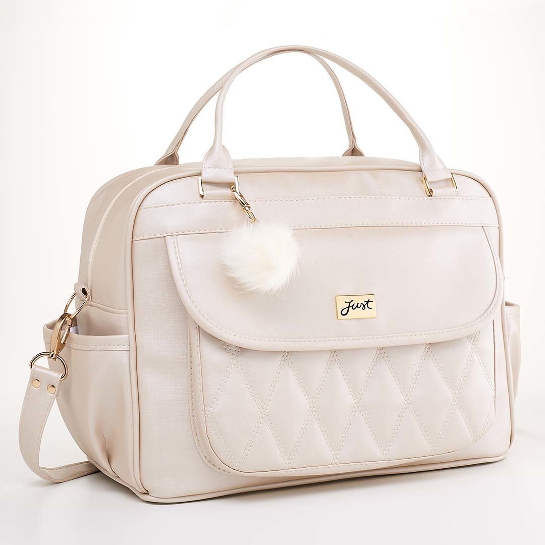 Compartimento principal amplo, possui quatro divisões internas e um bolso com zíper para roupinhas sujas. Bolsos laterais, além de bolso frontal com detalhes com matelassê e bolso posterior com zíper. Possui pés em metal e alça de ombro ajustável e removível. Acompanha trocador coordenado com o material da bolsa e chaveiro em pelo pompom sintético cru.