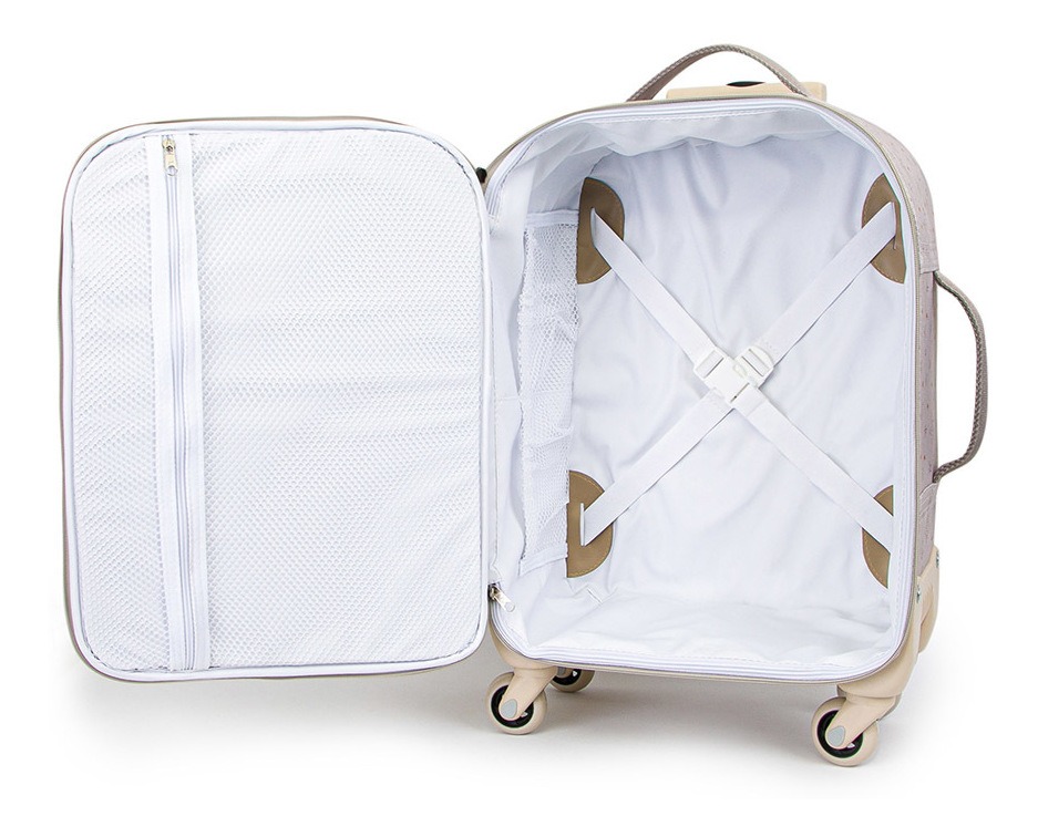 amplo e com elásticos para segurar os pertences do bebê. Possui um bolso grande em tela, com fechamento em zíper dois bolso menores com elástico que auxiliam na separação de pequenos objetos. O bolso frontal é amplo, com zíper.Ainda, a mala possui um bolso traseiro reto que pode ser utilizado para guardar documentos e itens com pouco volume.
